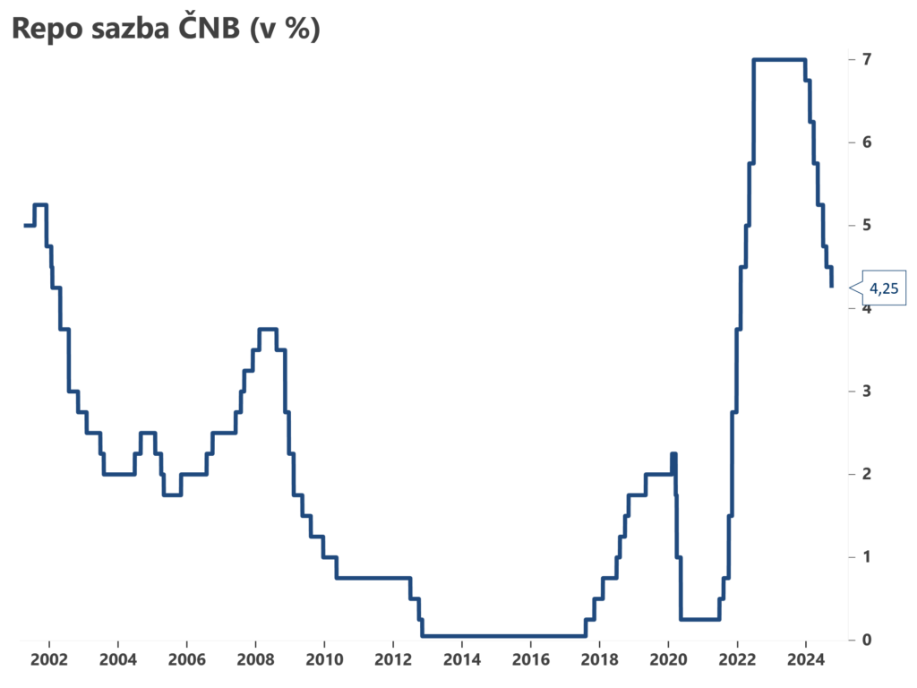 Další pozvolné snižování sazeb ČNB trhy příliš ner... by · 25 září, 2024 · no commentČeská národní banka na dnešním zasedání dle očekávání pokračovala v pozvolném snižování sazeb o 25 bb. Klíčová dvoutýdenní repo sazba tak dosáhla 4,25 %. Rozhodnutí se obešlo bez významné reakce na finančních trzích, když tento krok byl plně zaceněn. Z...