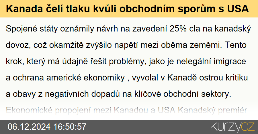 Spojené státy oznámily návrh na zavedení 25% cla na kanadský dovoz, což okamžitě zvýšilo napětí mezi oběma zeměmi. Tento krok, který má údajně řešit problémy, jako je nelegální imigrace a ochrana americké ekonomiky, vyvolal v Kanadě ostrou kritiku a ob…