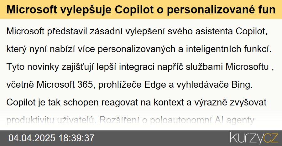Microsoft představil zásadní vylepšení svého asistenta Copilot, který nyní nabízí více personalizovaných a inteligentních funkcí. Tyto novinky zajišťují lepší integraci napříč službami Microsoftu, včetně Microsoft 365, prohlížeče Edge a vyhledávače Bing. Copilot je tak schopen reagovat na kontext a výrazně zvyšovat produktivitu uživatelů.