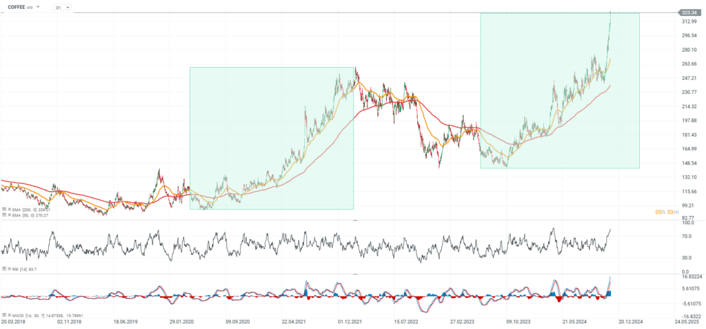 KÁVA roste o 4,6 % kvůli obavám z nabídky a americ... by · 27 listopadu, 2024 · no commentFutures na arabiku rostou o 4,6 % na $323 kvůli šířícím se obavám z globálního nedostatku dodávek (sucho a horké počasí v Brazílii) a hrozbě zavedení cel na dovoz do USA. Ceny letos vzrostly o více než 70 %, což ...
