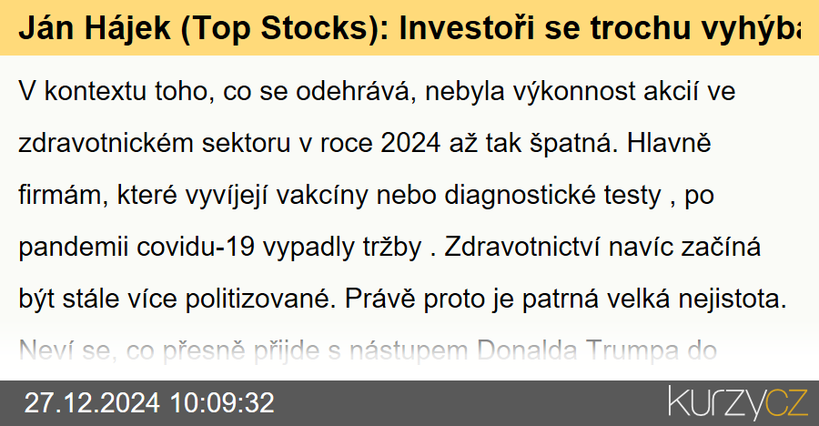 Ján Hájek (Top Stocks): Investoři se trochu vyhýba... by · 27 prosince, 2024 · no commentV kontextu toho, co se odehrává, nebyla výkonnost akcií ve zdravotnickém sektoru v roce 2024 až tak špatná. Hlavně firmám, které vyvíjejí vakcíny nebo diagnostické testy, po pandemii covidu-19 vypadly tržby. Zdravotnictví navíc začíná být stále více...