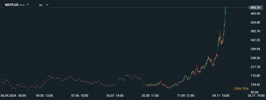 Akcie společnosti MicroStrategy (MSTR.US) vzrostly o 15 % na 494 USD, což je nové 52týdenní maximum, v návaznosti na rally Bitcoinu, který dosáhl 94 000 USD. Společnost je největším korporátním držitelem Bitcoinu, s celkovým objemem 331 200 BTC v hodno…