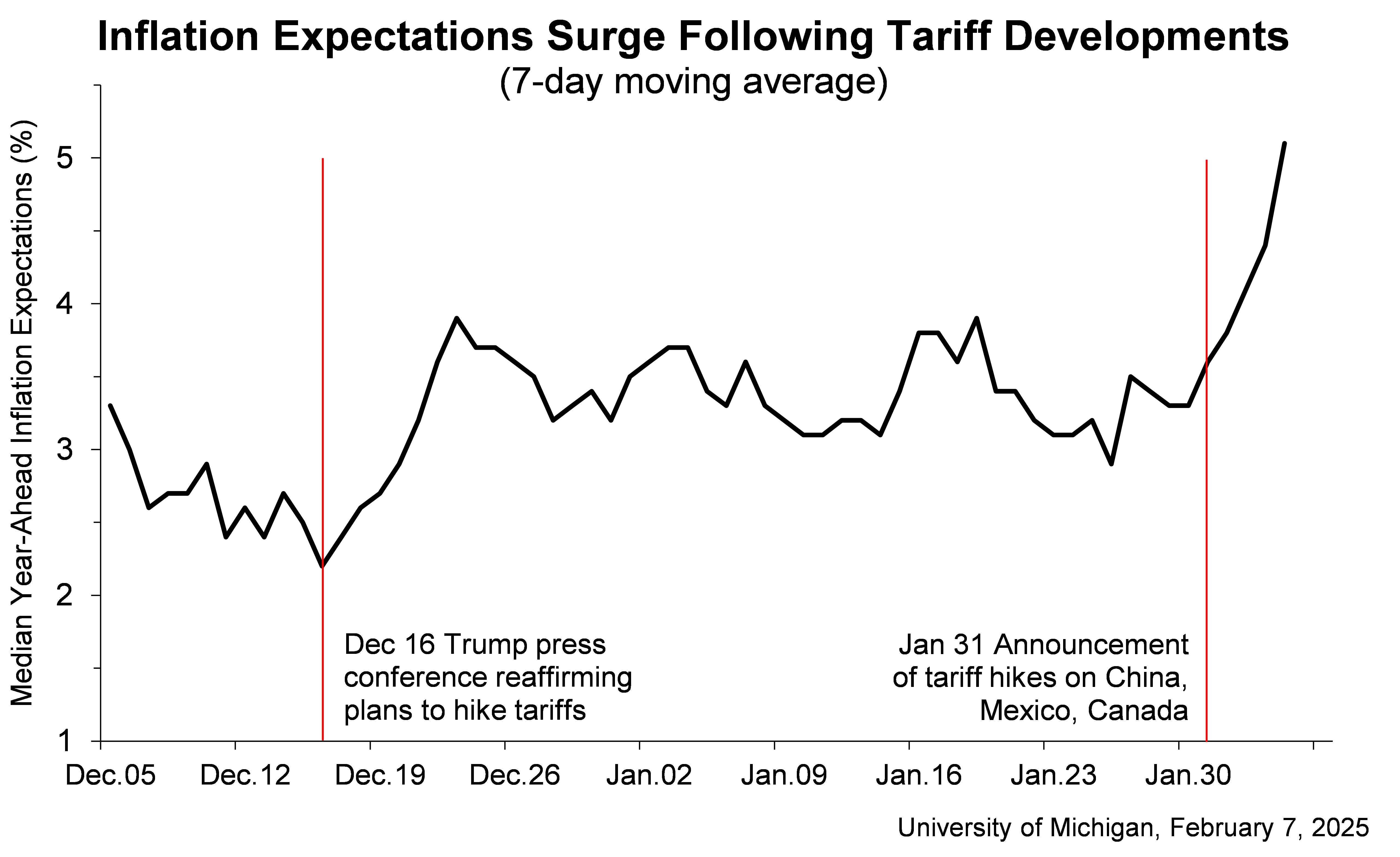 Roční inflační očekávání v USA ukazují reálné obavy z cel. Zdroj: University of Michigan