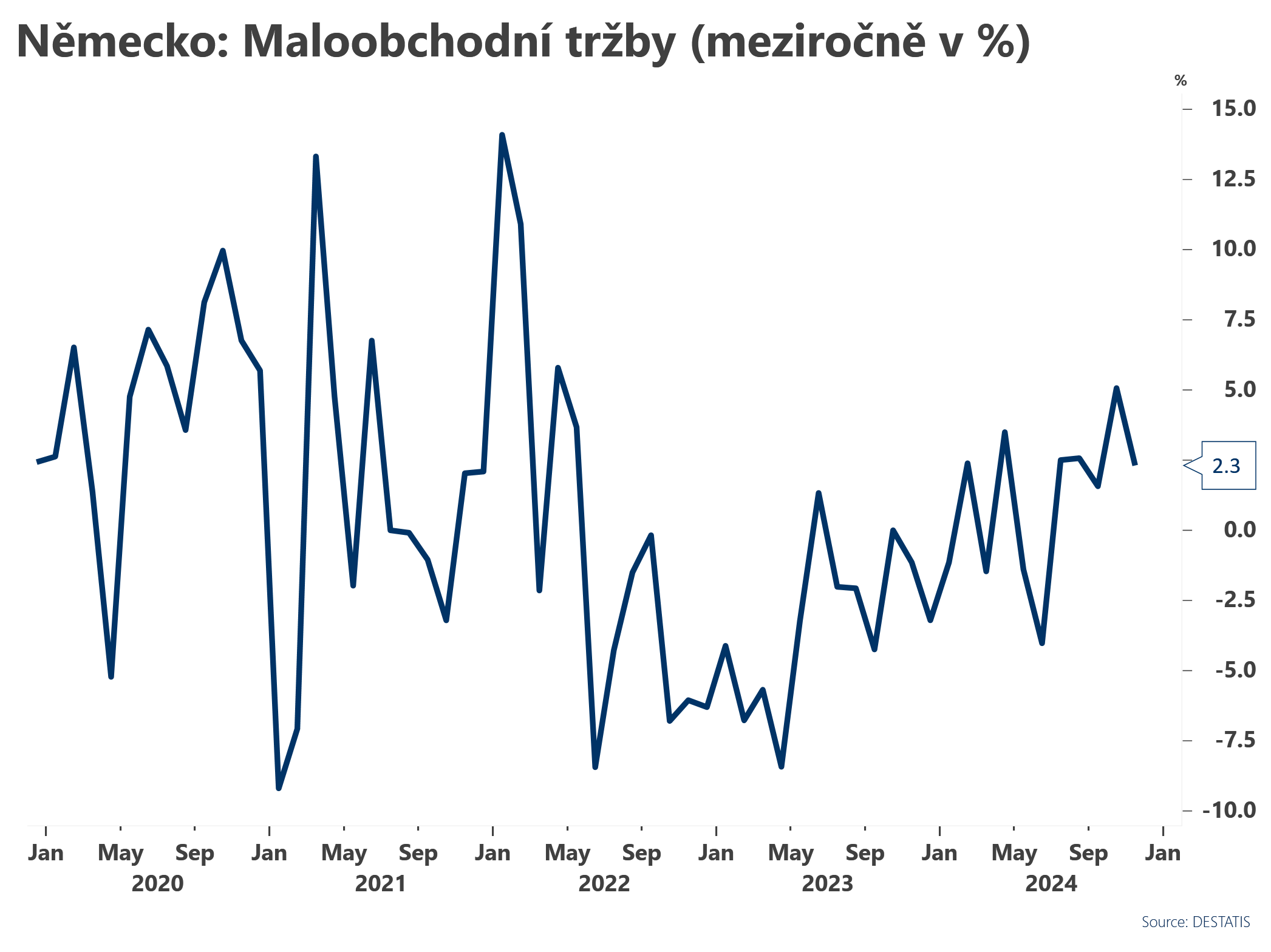 Zpravy-z-burzyTržby v Německu se snížily na +2,3 % meziročně opr... by notifee99@gmail.com · 8 ledna, 2025 · no comment Maloobchodní tržby se v listopadu snížily na +2,3 % meziročně oproti revidovaným +5,1 % v říjnu. Trhy očekávaly snížení na +2,5 % meziročně. PREVIOUSEK – ukazatele ekonomické i spotřebitelské d... 8 ledna, 2025 NEXTKomoditní výhled na 2025: Komodity bude držet na u... 8 ledna, 2025 Napsat komentář Zrušit odpověď na komentář Uložit do prohlížeče jméno, e-mail a webovou stránku pro budoucí komentáře.