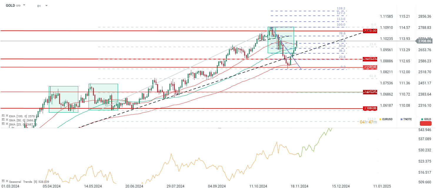 Zlato znovu dosáhlo úrovně 2 700 USD a překonalo zónu definovanou 50- a 100denními klouzavými průměry. Tento pohyb neguje nedávný klesající trend tím, že překonává 61,8% Fibonacciho retracement předchozího poklesu. Dalším potenciálním cílem je úroveň kolem 78,6% Fibonacciho retracementu.